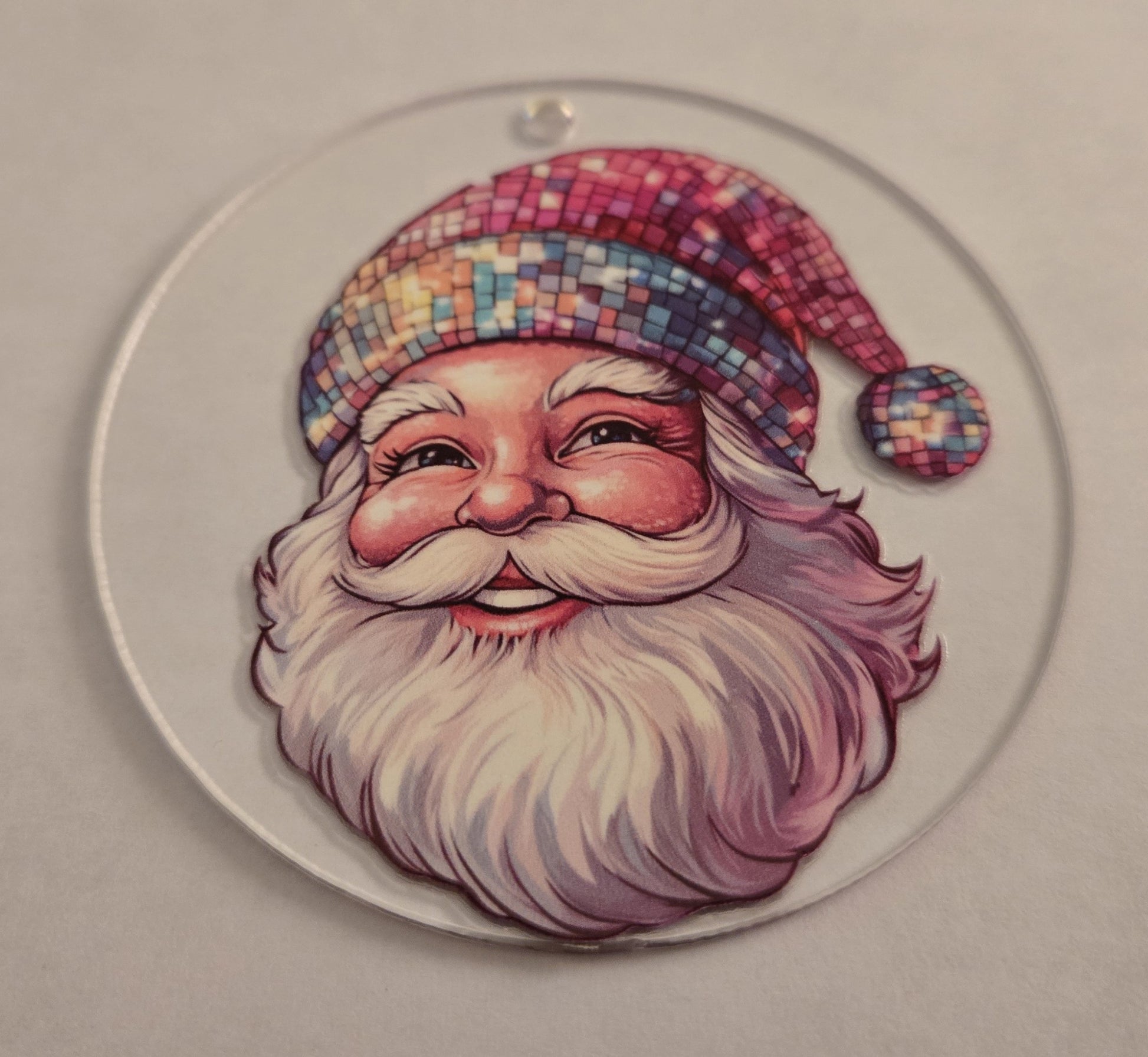 The Disco Hat Santa Claus Ornament combines festive tradition with a modern sparkle. Crafted on clear acrylic, it features Santa’s iconic white beard paired with a glittery disco-style hat for a playful yet refined look. With a convenient ribbon hanger, this ornament adds a touch of holiday cheer to your Christmas tree.