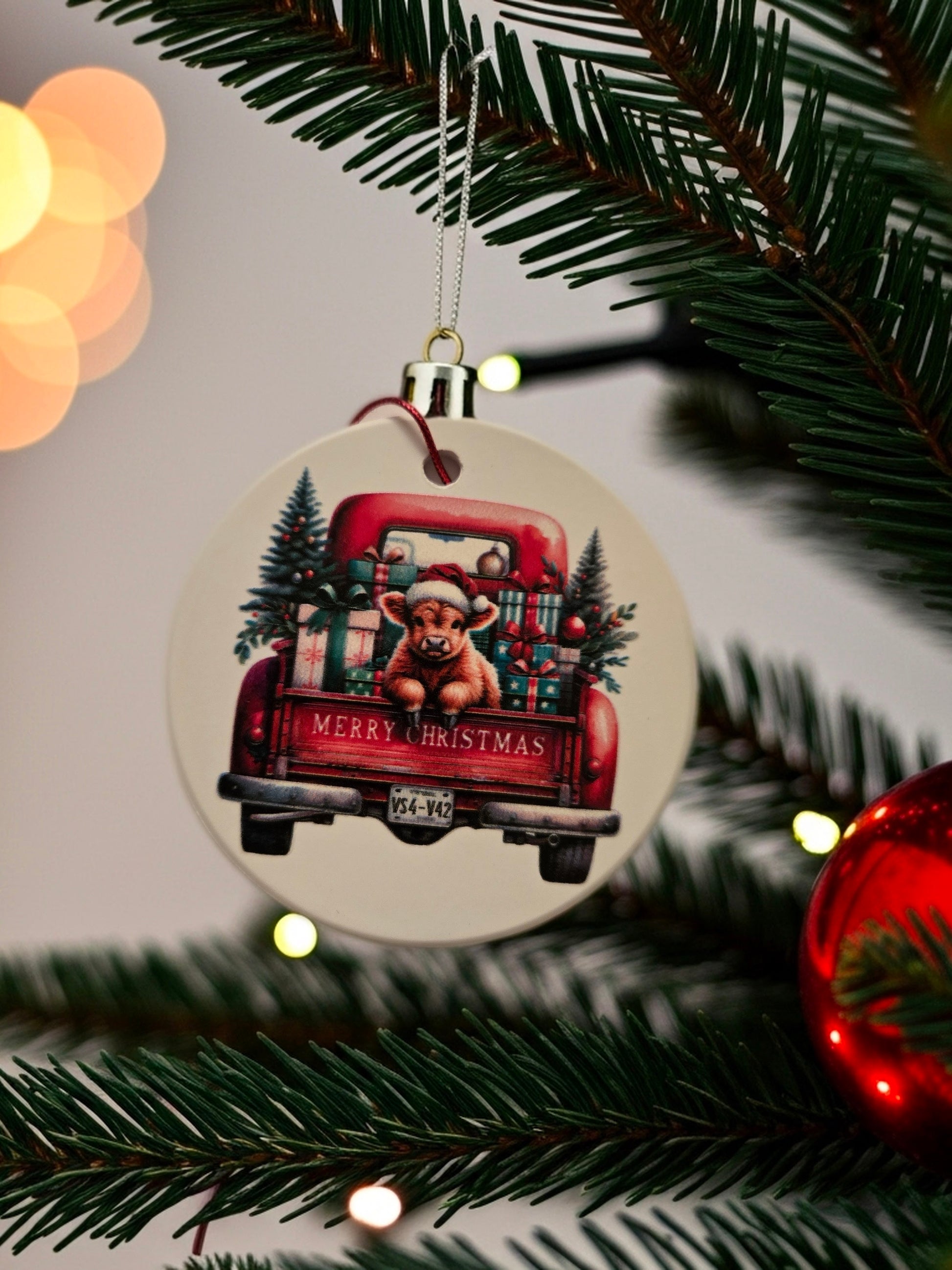 Celebrate the season with this charming ceramic ornament featuring a beloved Highland cow nestled in the bed of a classic red farm truck, complete with a festive Christmas tree. Hand-crafted details capture the rustic appeal of countryside traditions, making it an ideal addition to holiday décor for those who appreciate farmhouse aesthetics and whimsical holiday charm. A delightful keepsake that brings warmth and character to any Christmas tree.